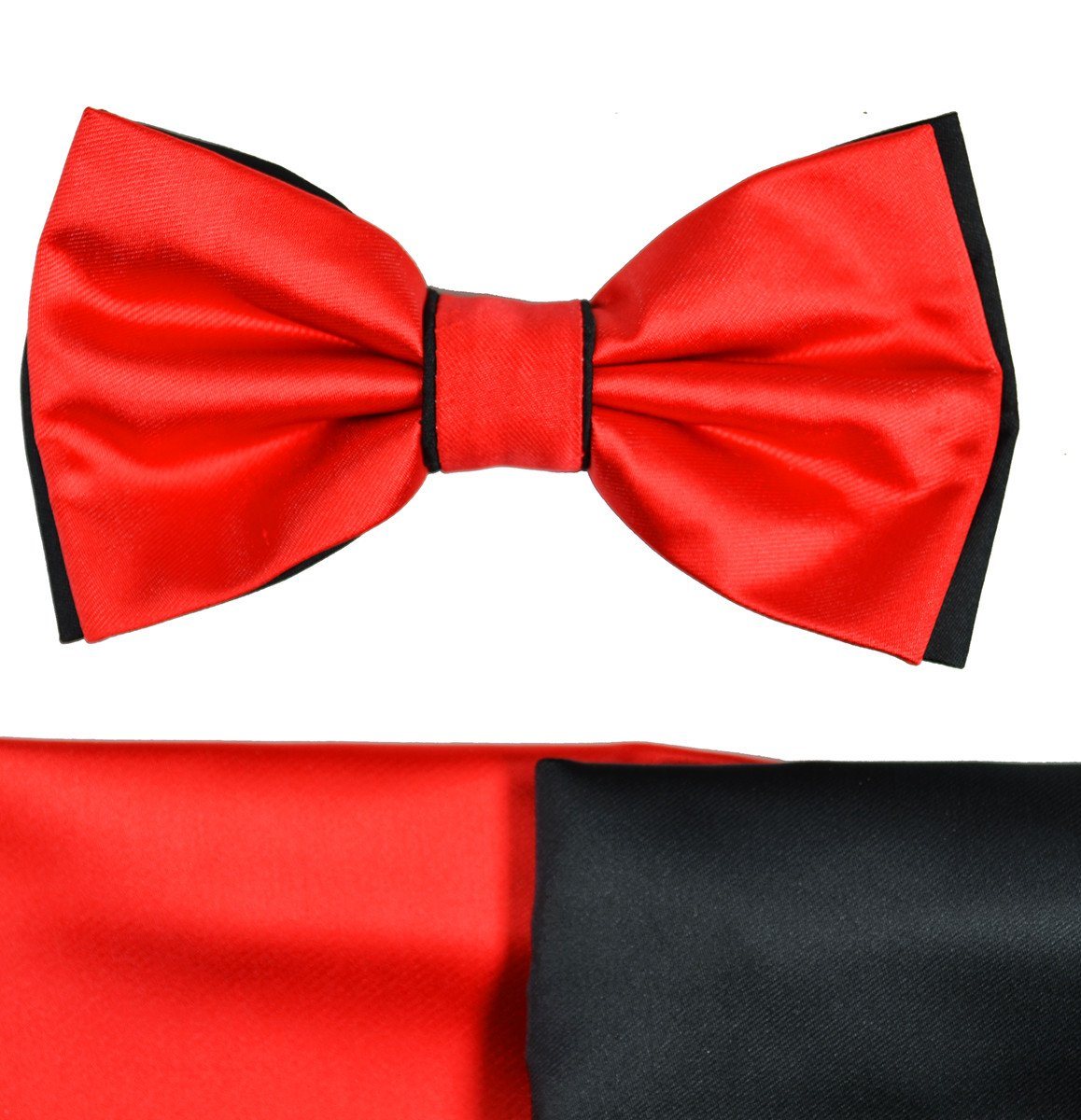 Introducing a sophisticated duo of formalwear for a show-stopping ensemble: Our exquisite Red and Black Bow Tie with 2 Pocket Squares set will be sure to turn heads. Crafted from 100% polyester material while offering unbeatable comfort, each item is imported and should be dry-cleaned only. Showcase your dapper style with our two-tone bow tie and two matching pocket squares (10" x 10"), effortlessly expressing a look that is both tasteful and exclusive.
