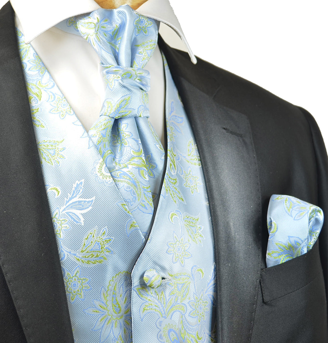 Floral tuxedo vest set in a sky blue and green floral pattern. This set includes the full back tuxedo vest, your choice of a matching necktie or pre-tied cravat, one matching pocket square and one pair of cufflinks. 100% microfiber. Imported.
