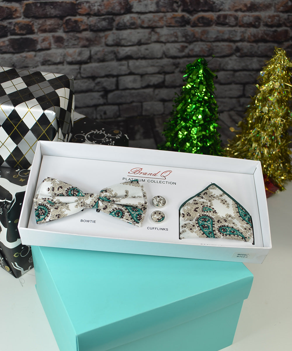 Smoke Pine Paisley Bow Tie, Pocket Square and Cufflinks Gift Box Set by Brand Q Platinum Collection. Bow Tie is...