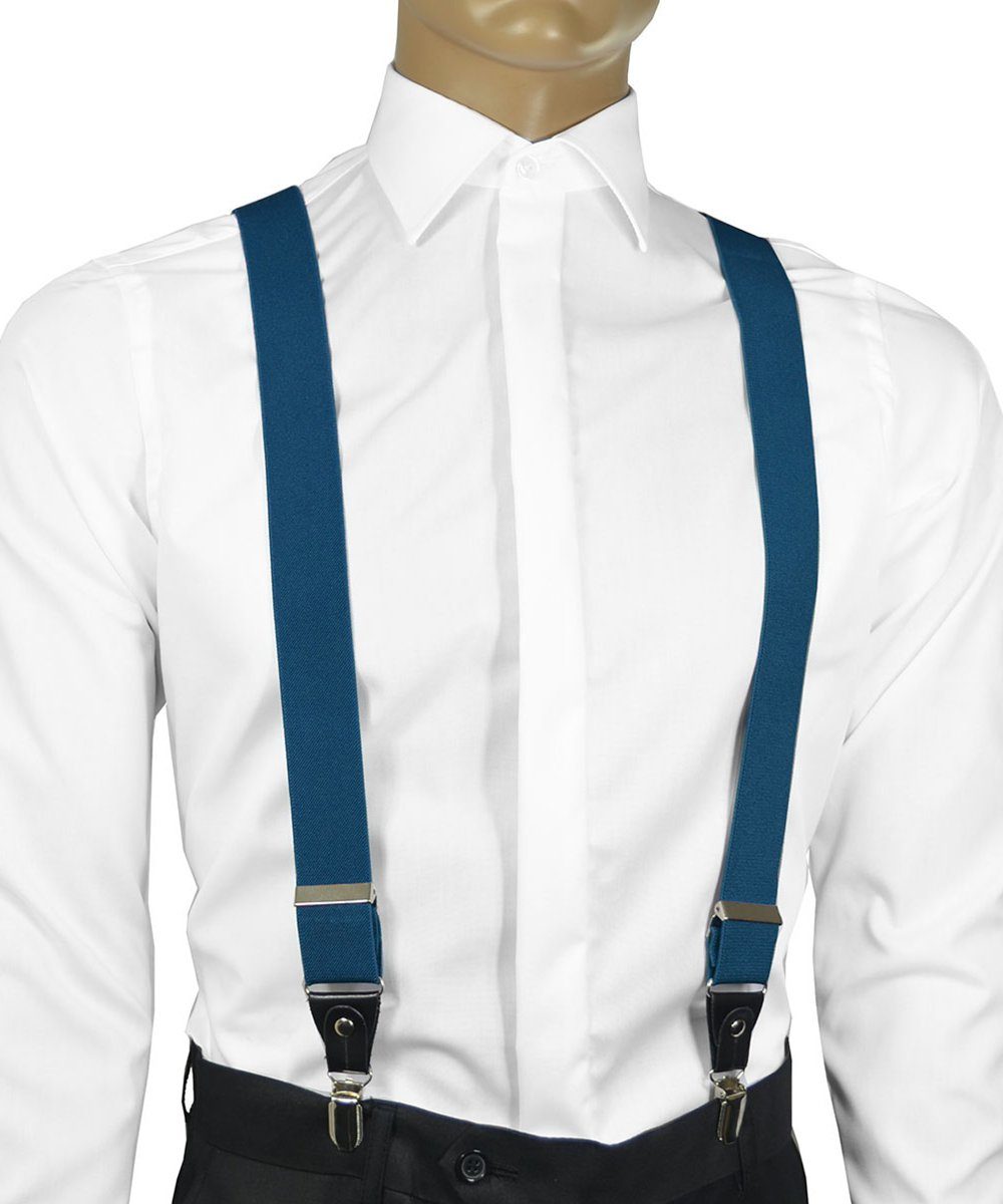 Solid Aqua Blue Y-Back Suspenders for Men. Combine function and fashion with these solid elastic suspenders. These Suspenders are convertible, giving you the option to wear them with the Mylar clip and attach them to your pants, or fasten them to a suspender button with the included loops. Made of elastic Microfibers.