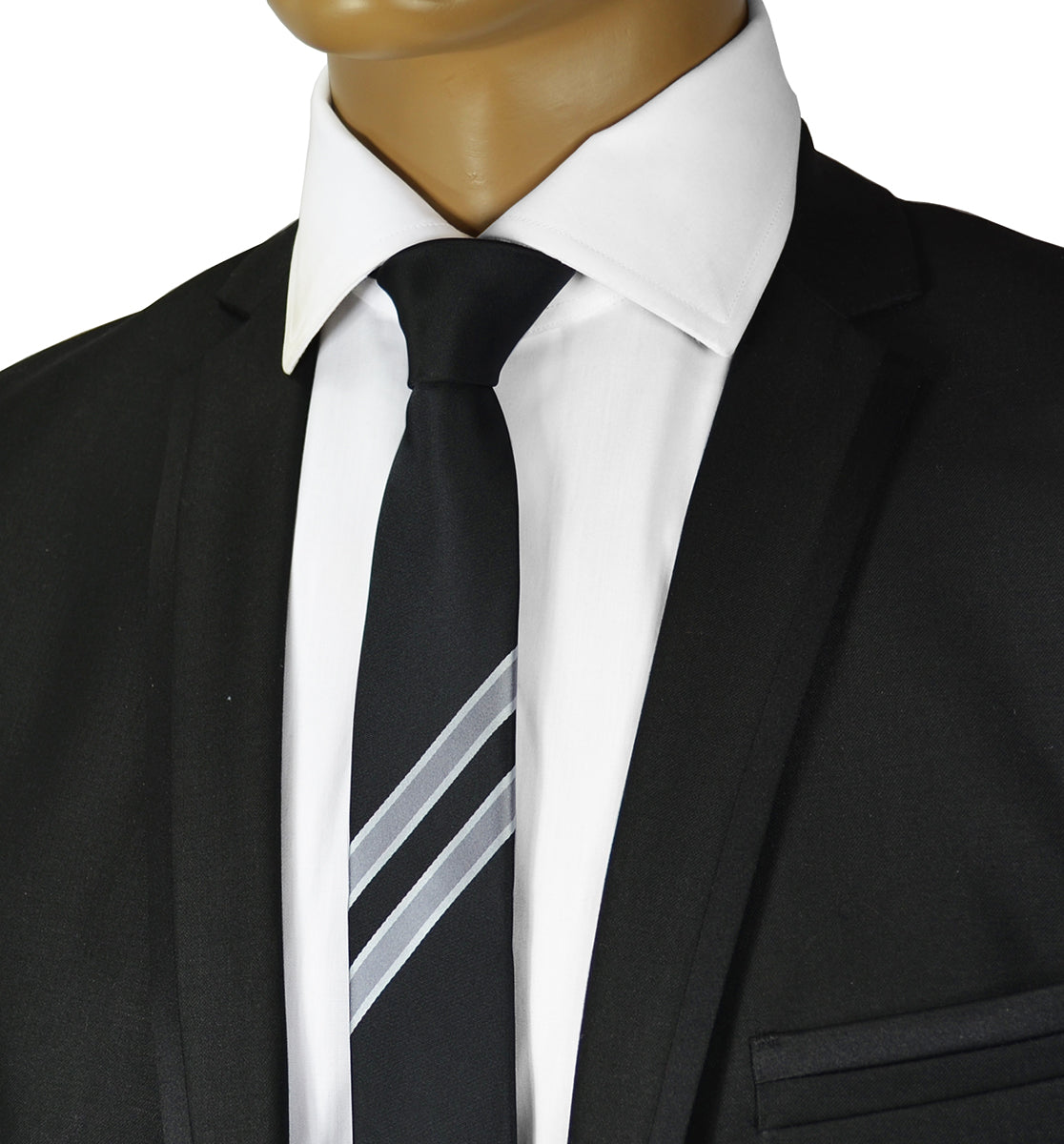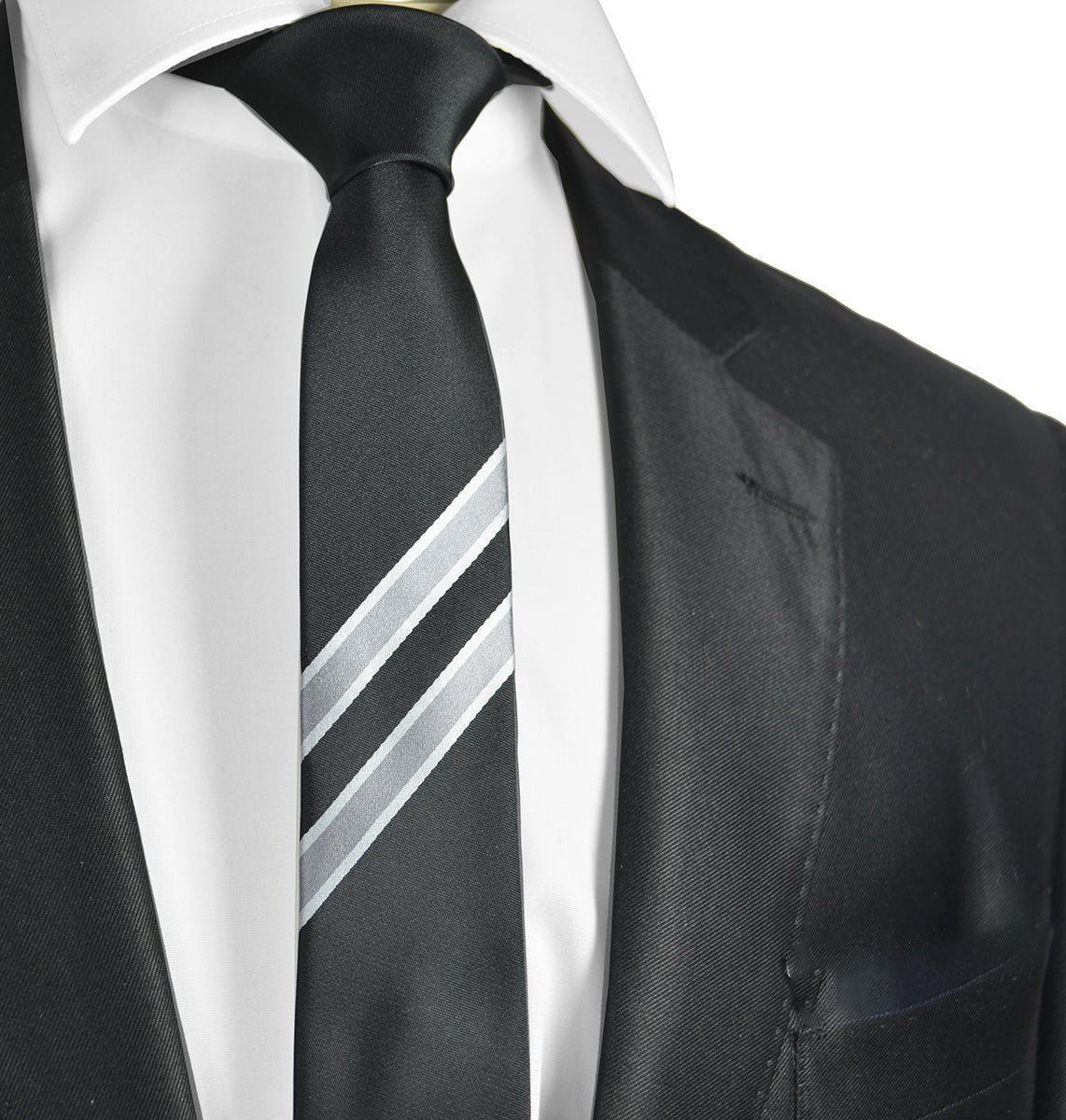 The Paul Malone Slim Panel Tie boasts an edgy yet refined design in black and silver. Ideal for both casual and formal settings, this luxury accessory adds sophistication to any ensemble. Handcrafted with 100% microfiber in a slim cut that measures 2 inches wide at the widest point, it offers both quality and style.