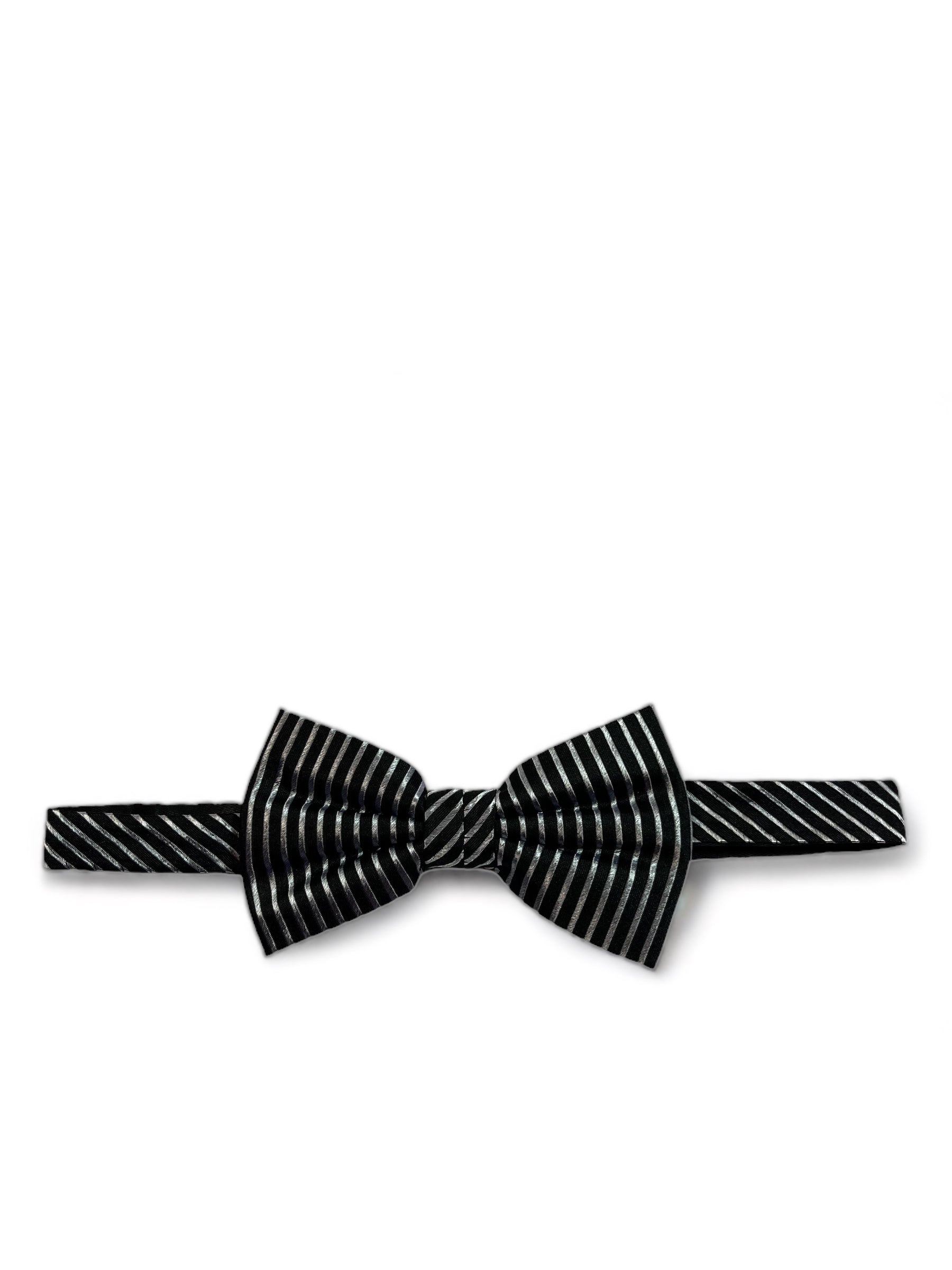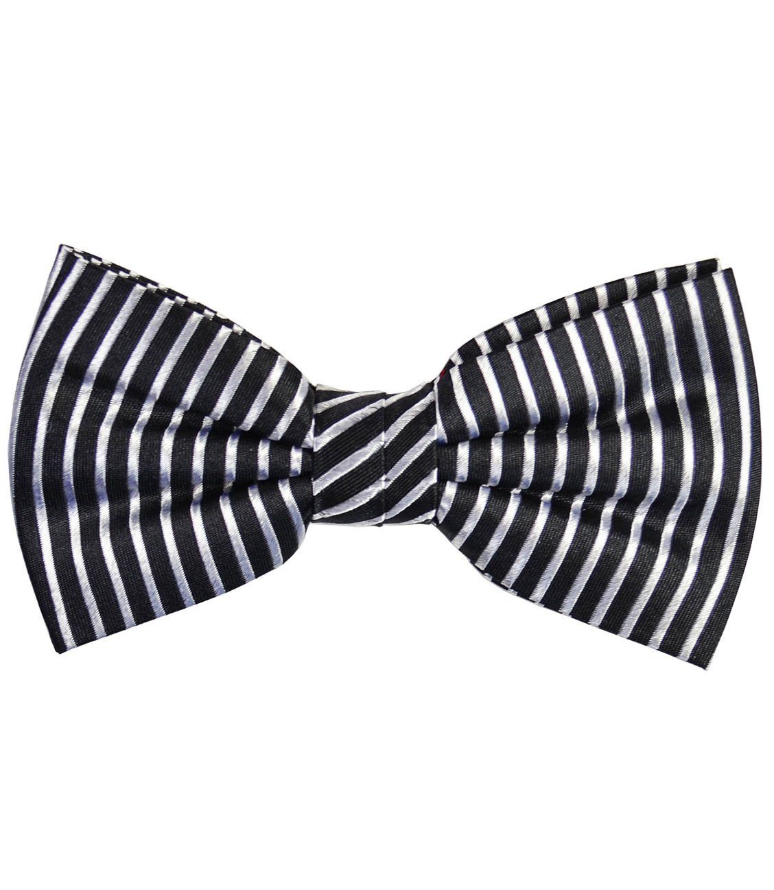 Black and Silver Striped Silk Bow Tie. Hand Made, Jacquard Woven,100% Mulberry Silk. Size adjustable from neck size 14.5 through 18. Imported. This bow tie is a sophisticated way to elevate any outfit or occasion. Crafted from the finest mulberry silk, this luxurious piece is a guarantee to turn heads and make a statement.
