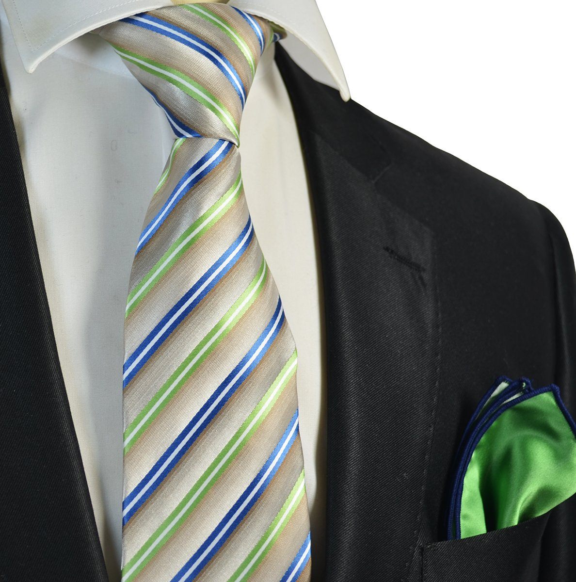 Blue and Green Striped Men's Tie and Pocket Square