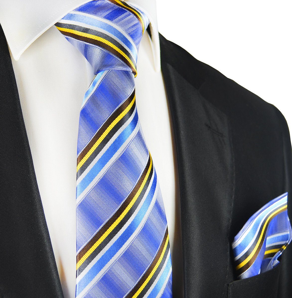 Experience the luxury and style of Blue Striped Silk Tie and Pocket Square - part of Paul Malone's renowned Premium... Read more