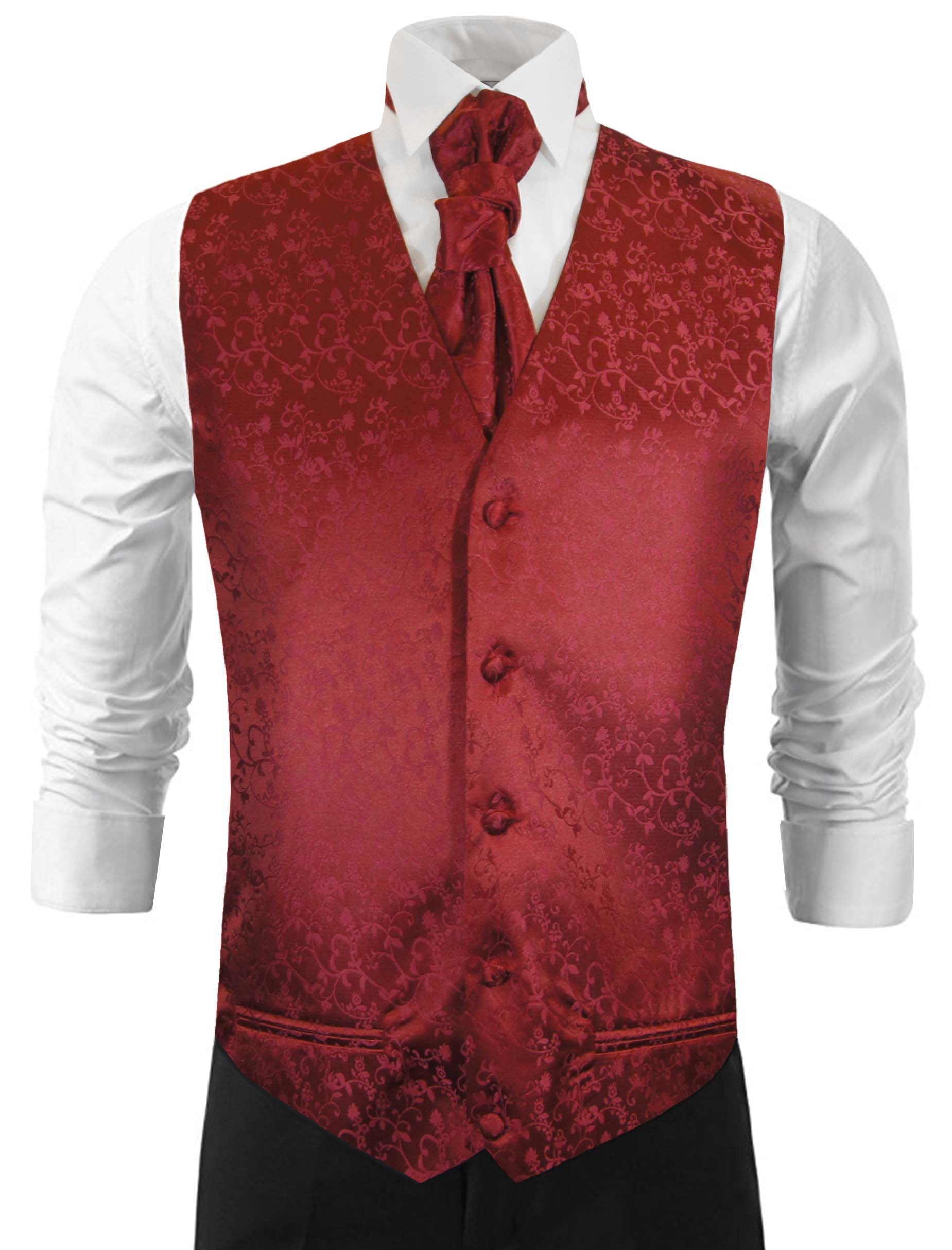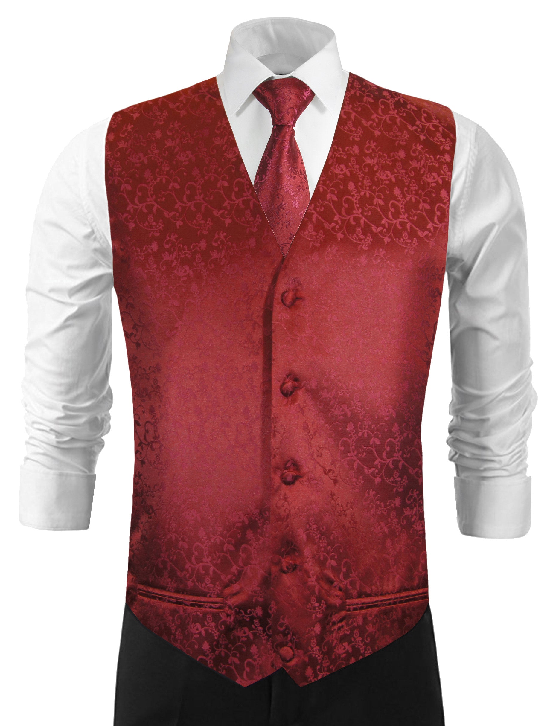 Elegant Burgundy Vines Suit Vest Set by Paul Malone. This tuxedo vest set includes the vest, your choice of necktie, pre-tied cravat or bow tie and one pair of cufflinks. Made for all formal events, from weddings to Proms. Full back. 100% microfiber. Imported.