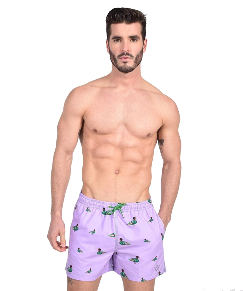 Lilac Duck Print Swim Trunks by Eight X . These trunks feature a 7in. inseam, lined and quick-drying. Side and...