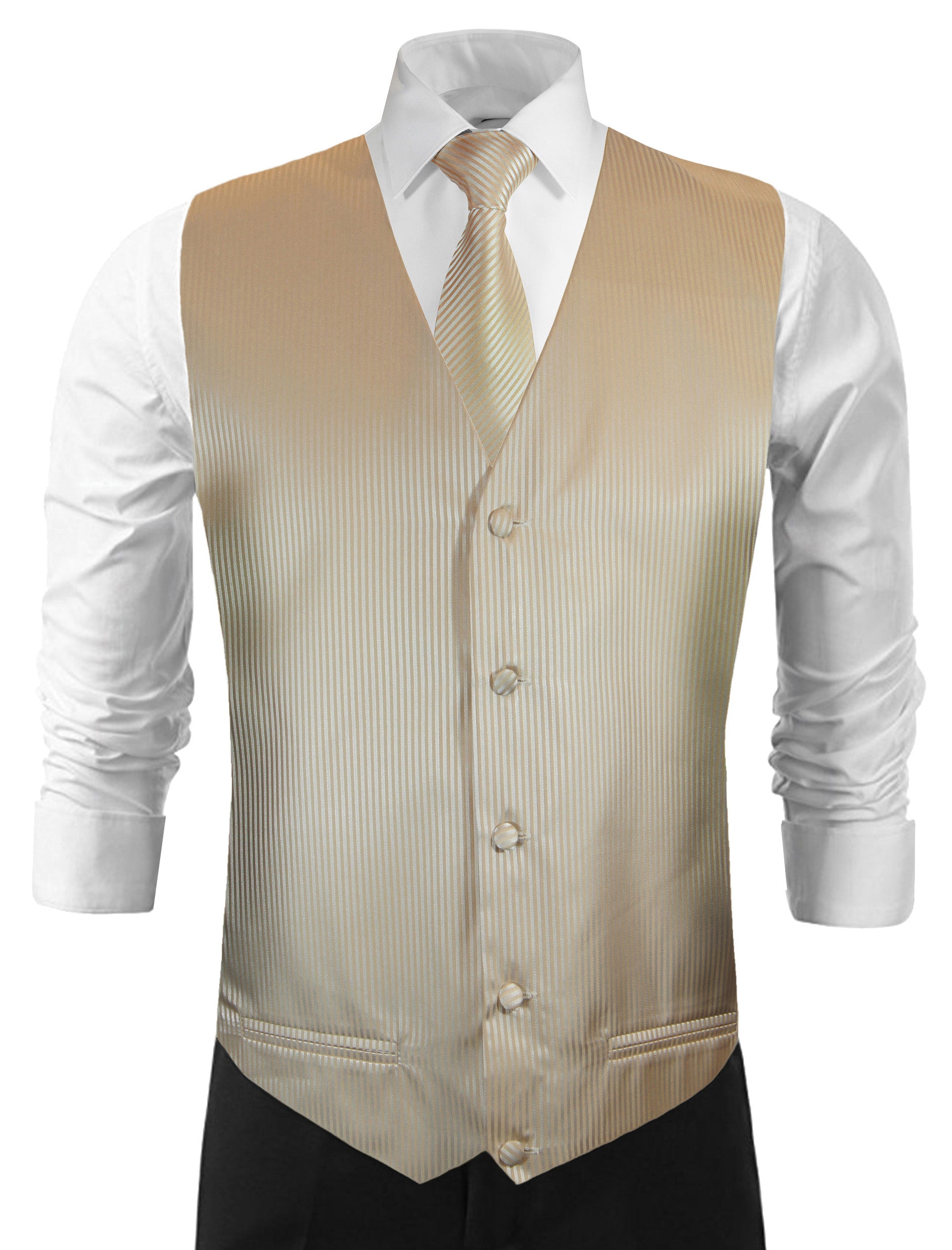 Spice up your formal suit with this espresso striped tuxedo vest set includes the vest, your choice of necktie or pre-tied formal cravat, pocket square and cufflinks. Full back. 100% microfiber . Imported.