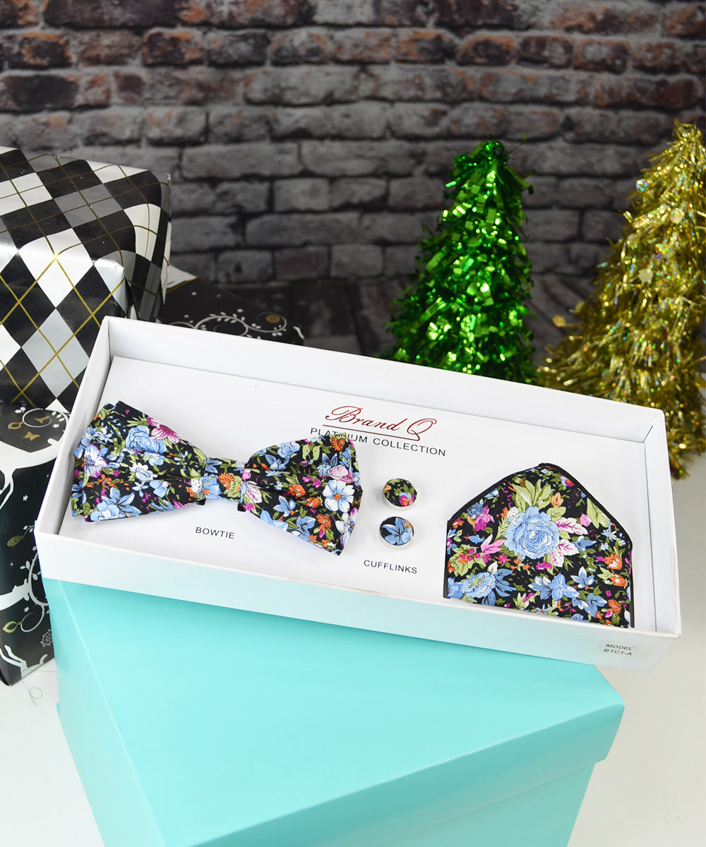 Blue, Black and Green Floral Bow Tie, Pocket Square and Cufflinks Gift Box Set by Brand Q Platinum Collection. Bow...
