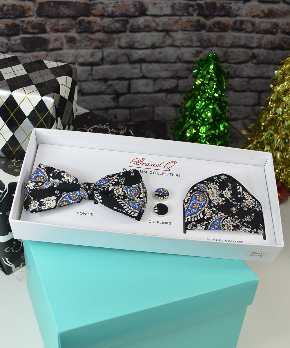 Black and Blue Paisley Bow Tie, Pocket Square and Cufflinks Gift Box Set by Brand Q Platinum Collection. Bow Tie...