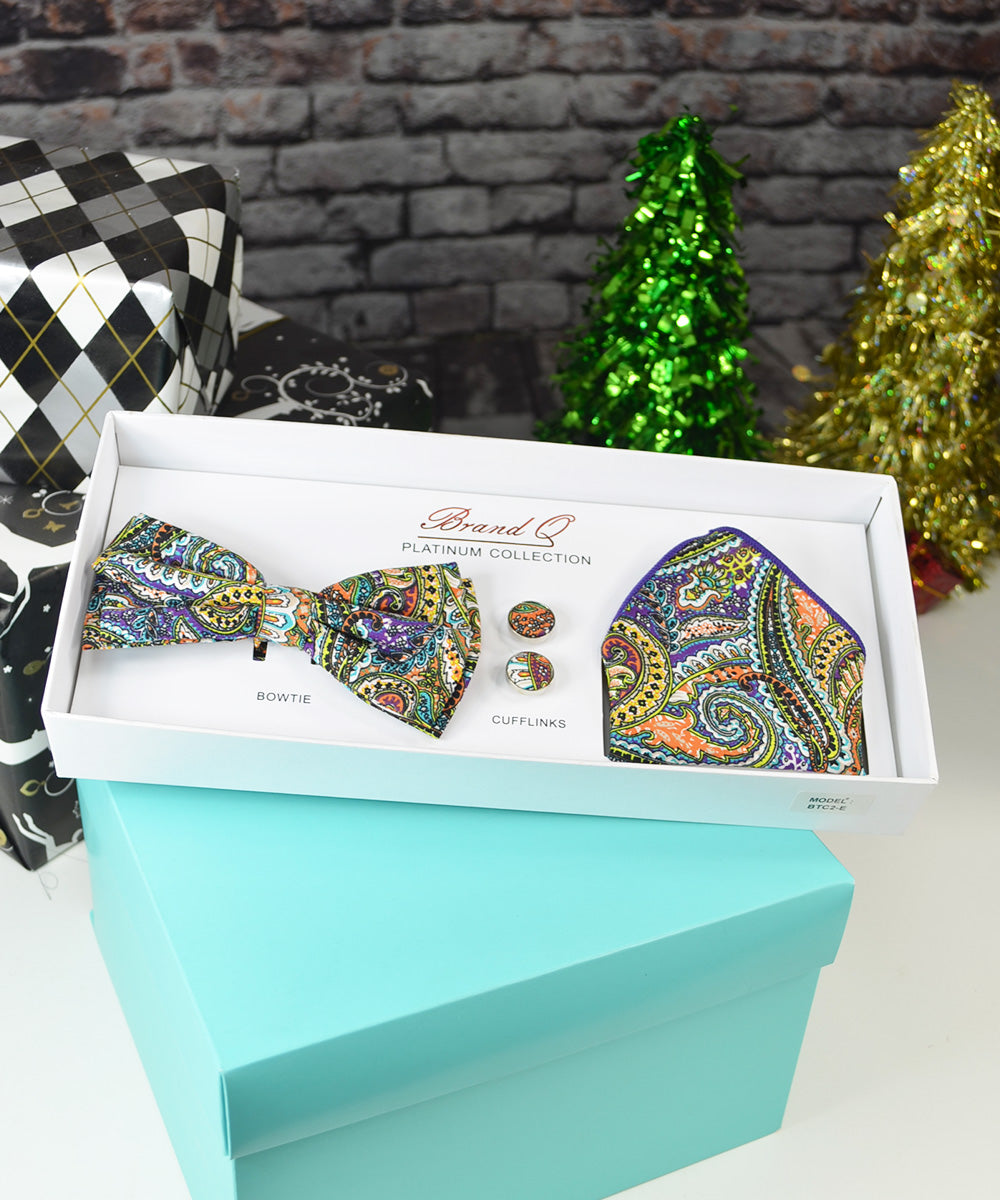 Purple Pennant Paisley Bow Tie, Pocket Square and Cufflinks Gift Box Set by Brand Q Platinum Collection. Bow Tie is...
