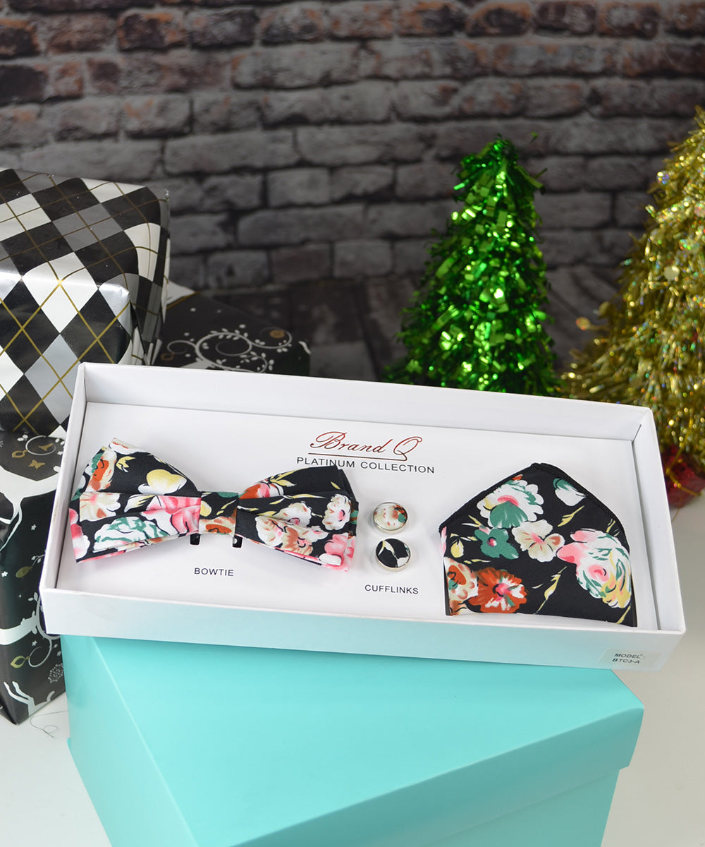 Black , Green and Pink Floral Bow Tie, Pocket Square and Cufflinks Gift Box Set by Brand Q Platinum Collection....