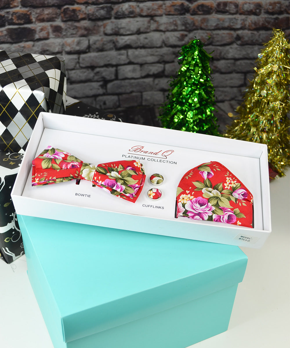 Poppy Red Floral Bow Tie, Pocket Square and Cufflinks Gift Box Set by Brand Q Platinum Collection. Bow Tie is...