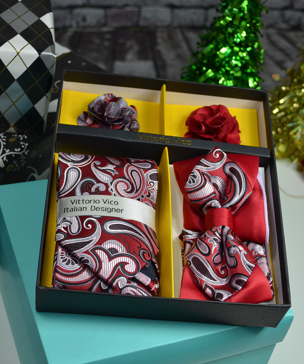This is a 6 piece Burgundy Gift Box Set including Necktie, Bow Tie, 2 matching Pocket Square and 2 matching...