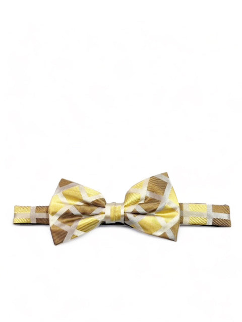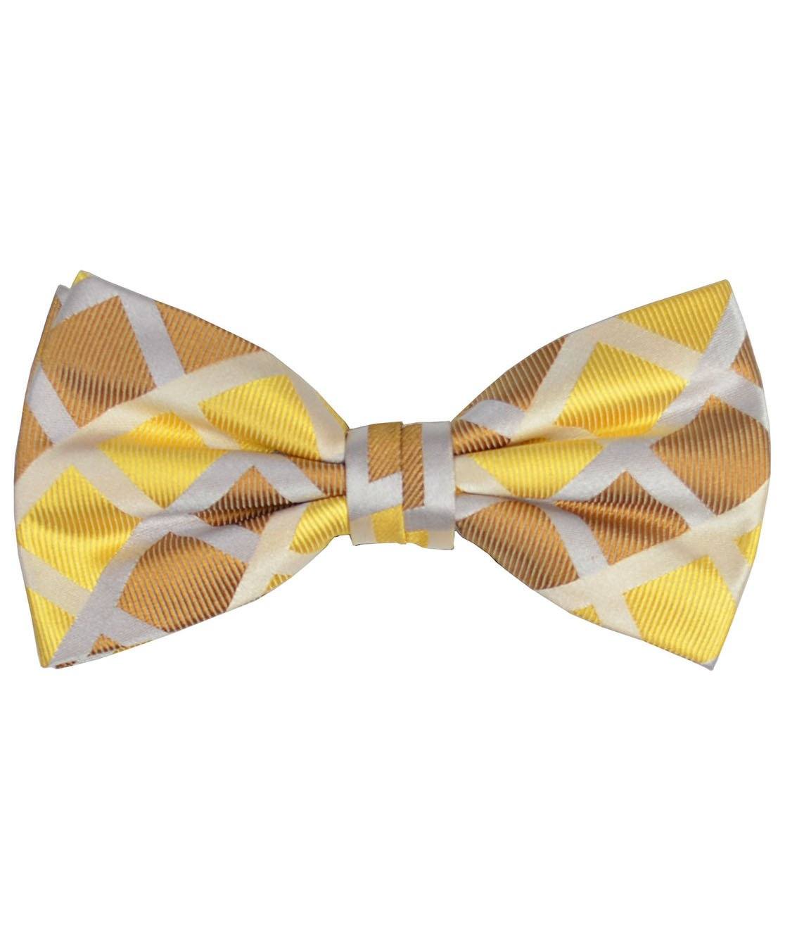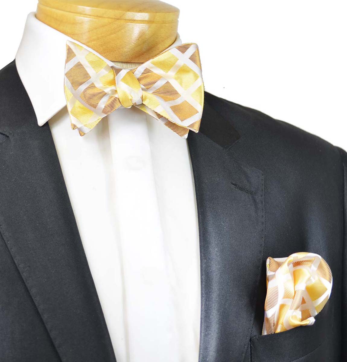 Gold and Tan Plaid Paul Malone Silk Bow Tie with matching Pocket Square. Size adjustable from neck size 14.5 through 18. 100% Silk. Imported. Experience luxurious craftsmanship that will take your look to the next level, with a timeless and exuberant set to make an unforgettable impression.