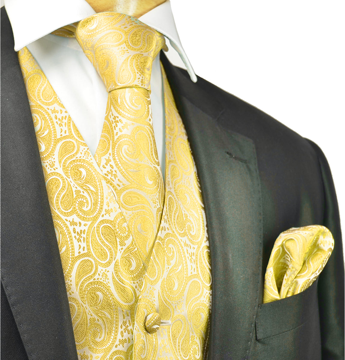 Elevate your formal look with the Glowing Gold Paisley Tuxedo Vest Set by Vittorio Farina for Paul Malone Palm Beach,...