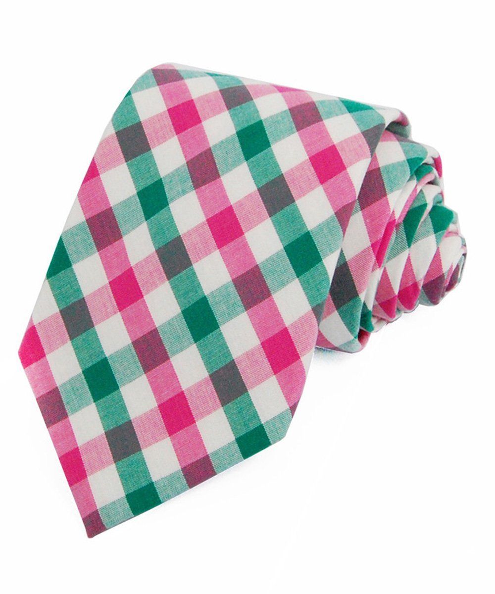 Exciting Cotton Necktie in a Green and Pink Plaid Pattern. A cool combination to wear daily at the Office or Casual...