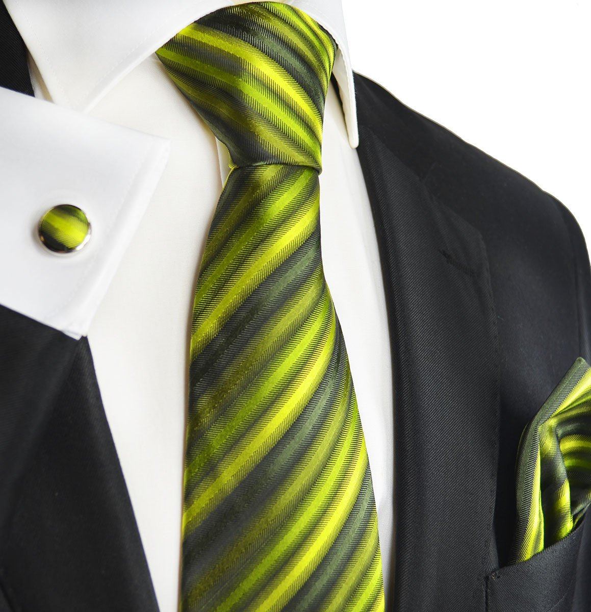 Classic Paul Malone tie with matching pocket square and cufflinks. Made of 100% pure mulberry silk, hand made and jacquard woven. Imported. Take your look to the next level with this timelessly luxurious set. Wrap yourself in the boldness of green stripes, and feel the confidence of the highest quality fabrics and craftsmanship. Dare to stand out!