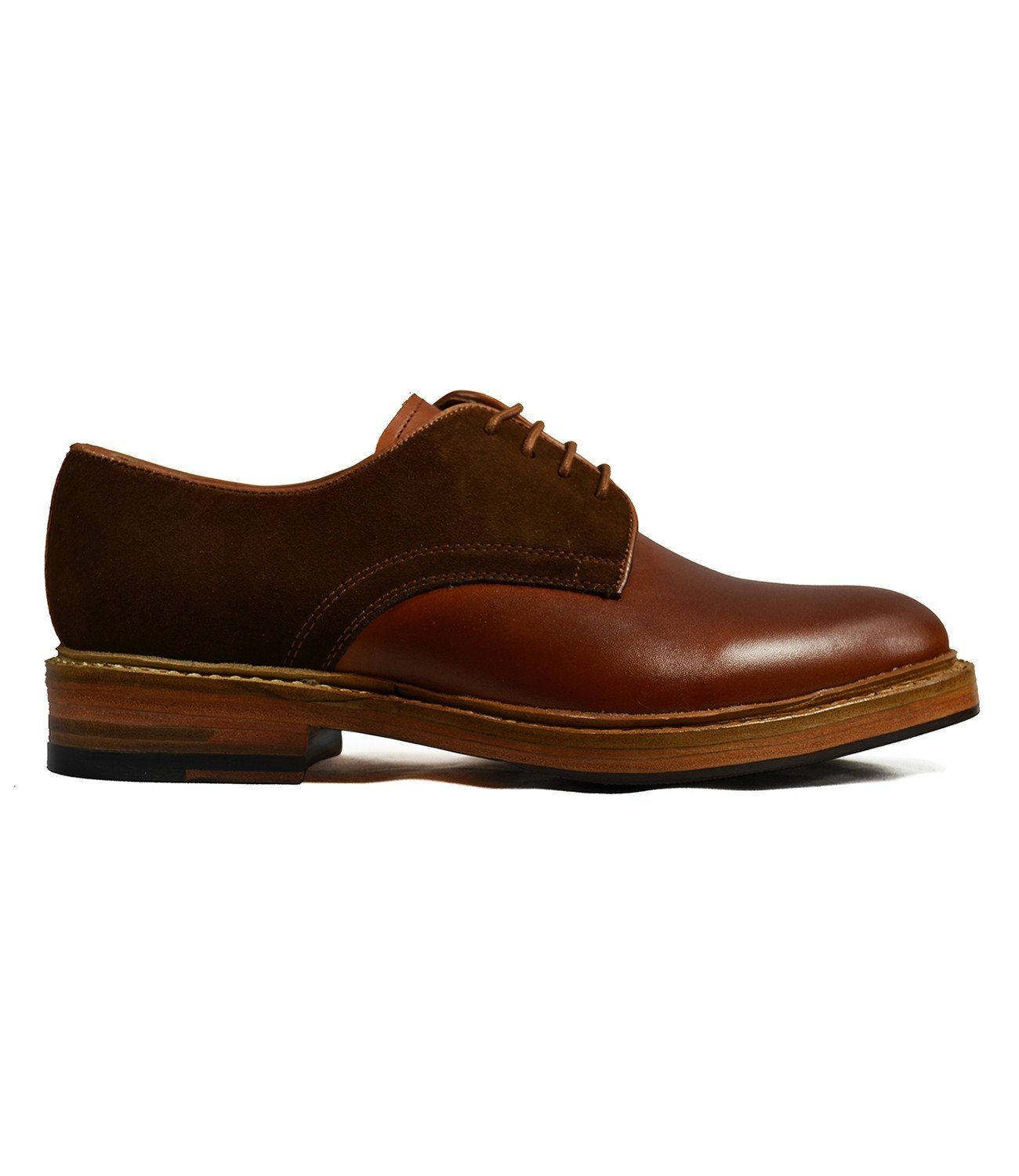 A classic men's shoe with a touch of modernity. Brown derby made with cow nappa and suede leathers. Smooth and equipped with a 4-hole lacing. 100% leather inside and sole. Goodyear welted. Imported.