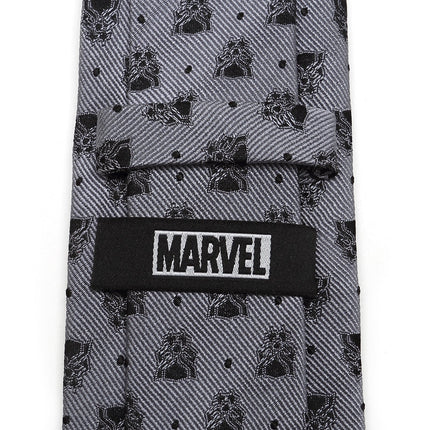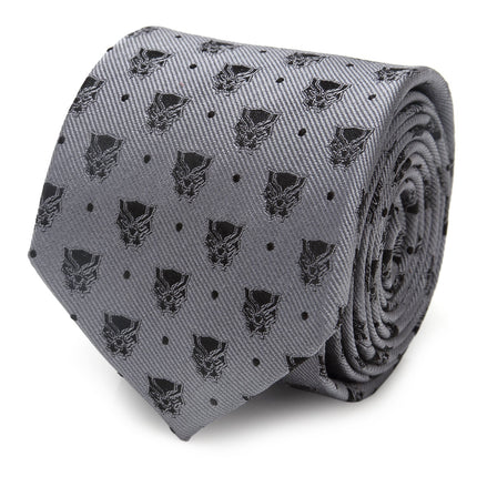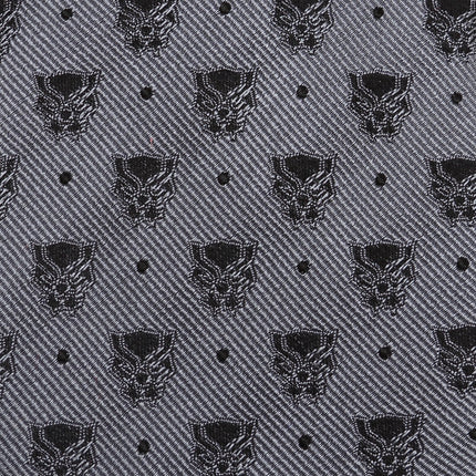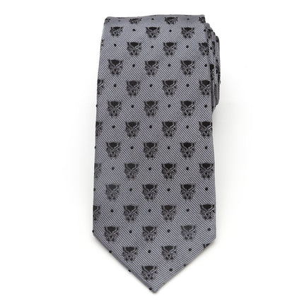 Cool gray forms the background color to this 100% silk tie. The Black Panther mask appears throughout in bold black...