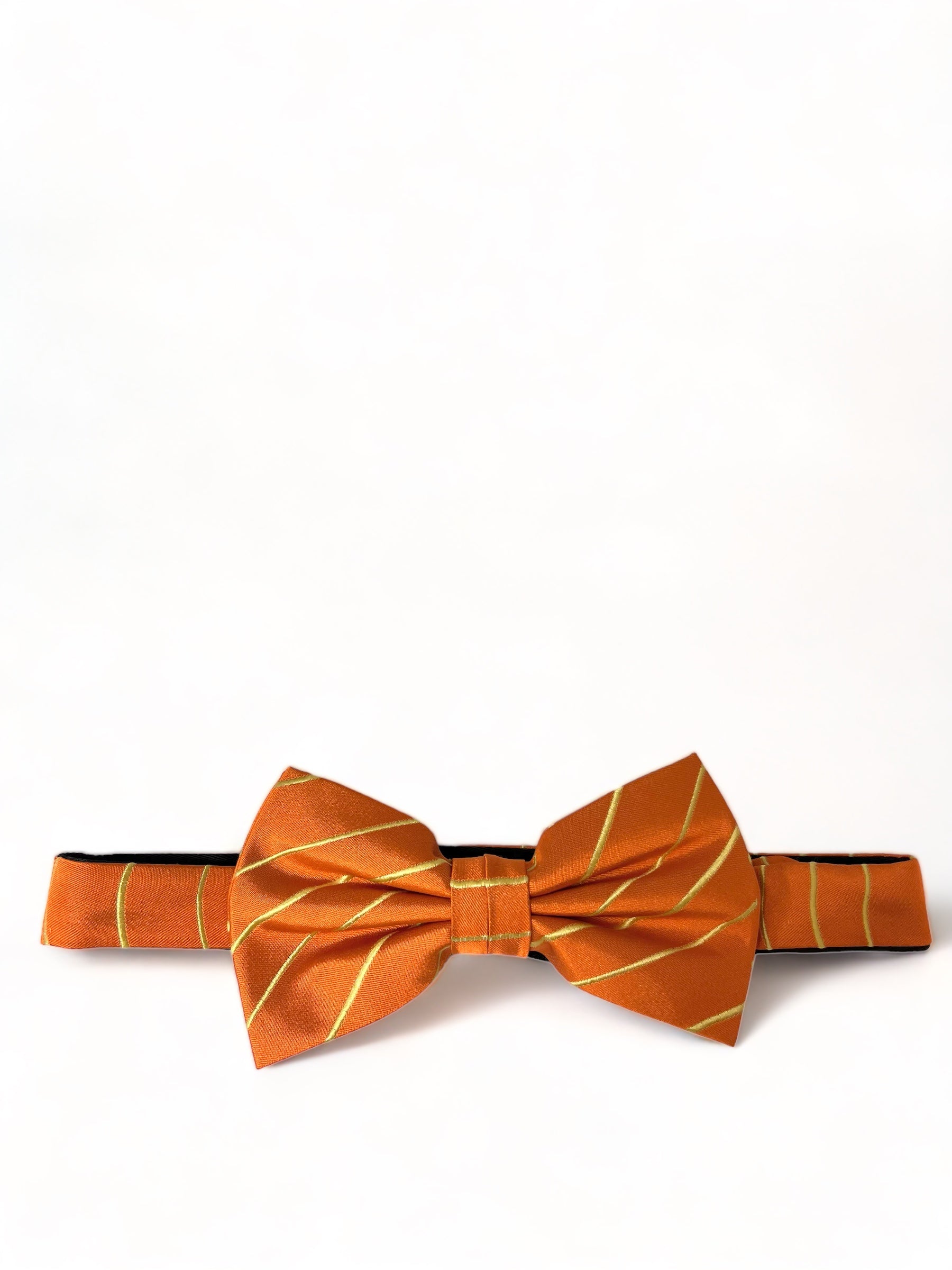 This Paul Malone Bow Tie and Pocket Square Set by Jaffa boasts an exquisite golden and orange striped pattern crafted...