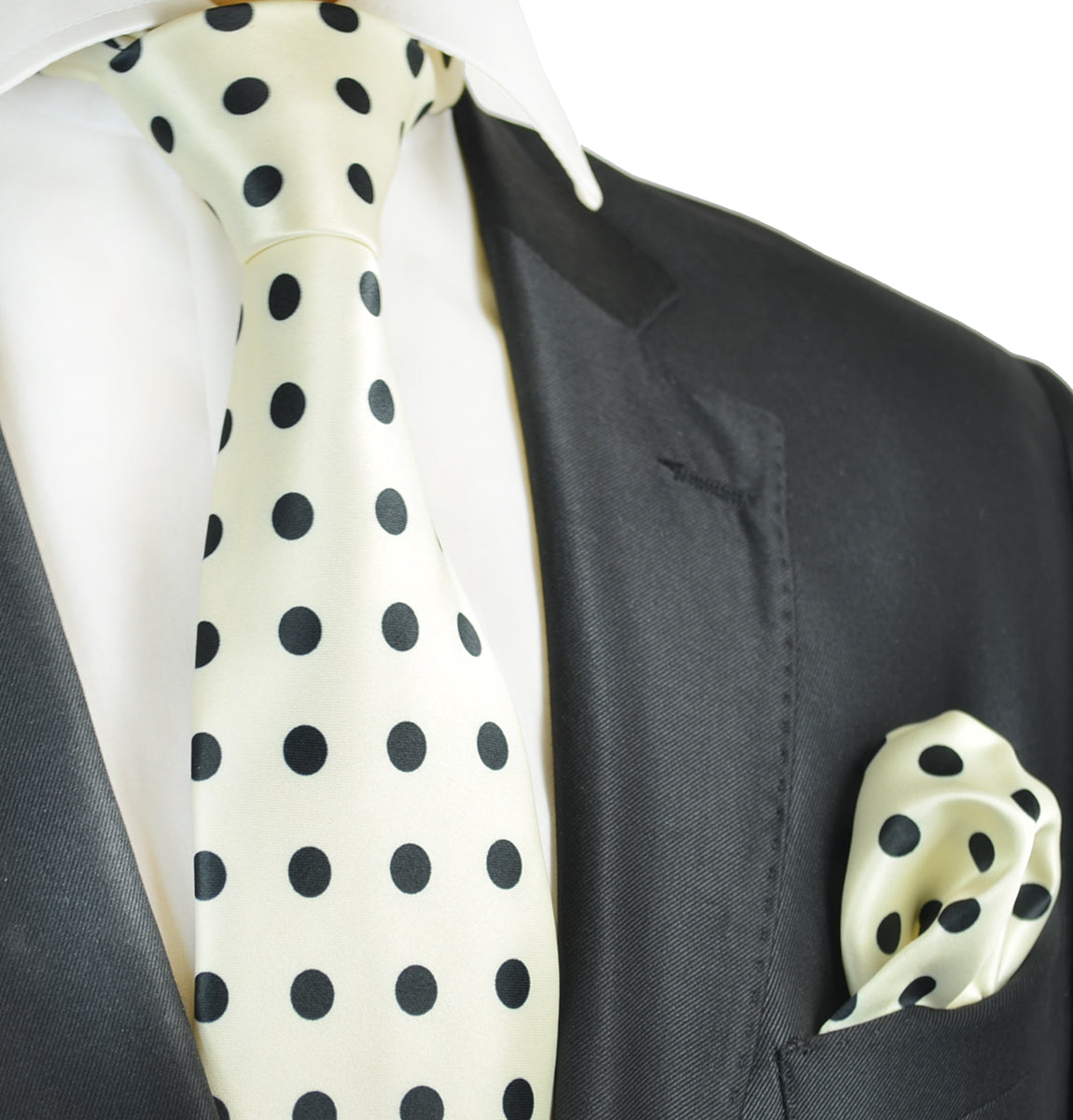 Indulge in opulence and refinement with our Ivory and Black Polka Dot Tie and Pocket Square set. Made from 100%...