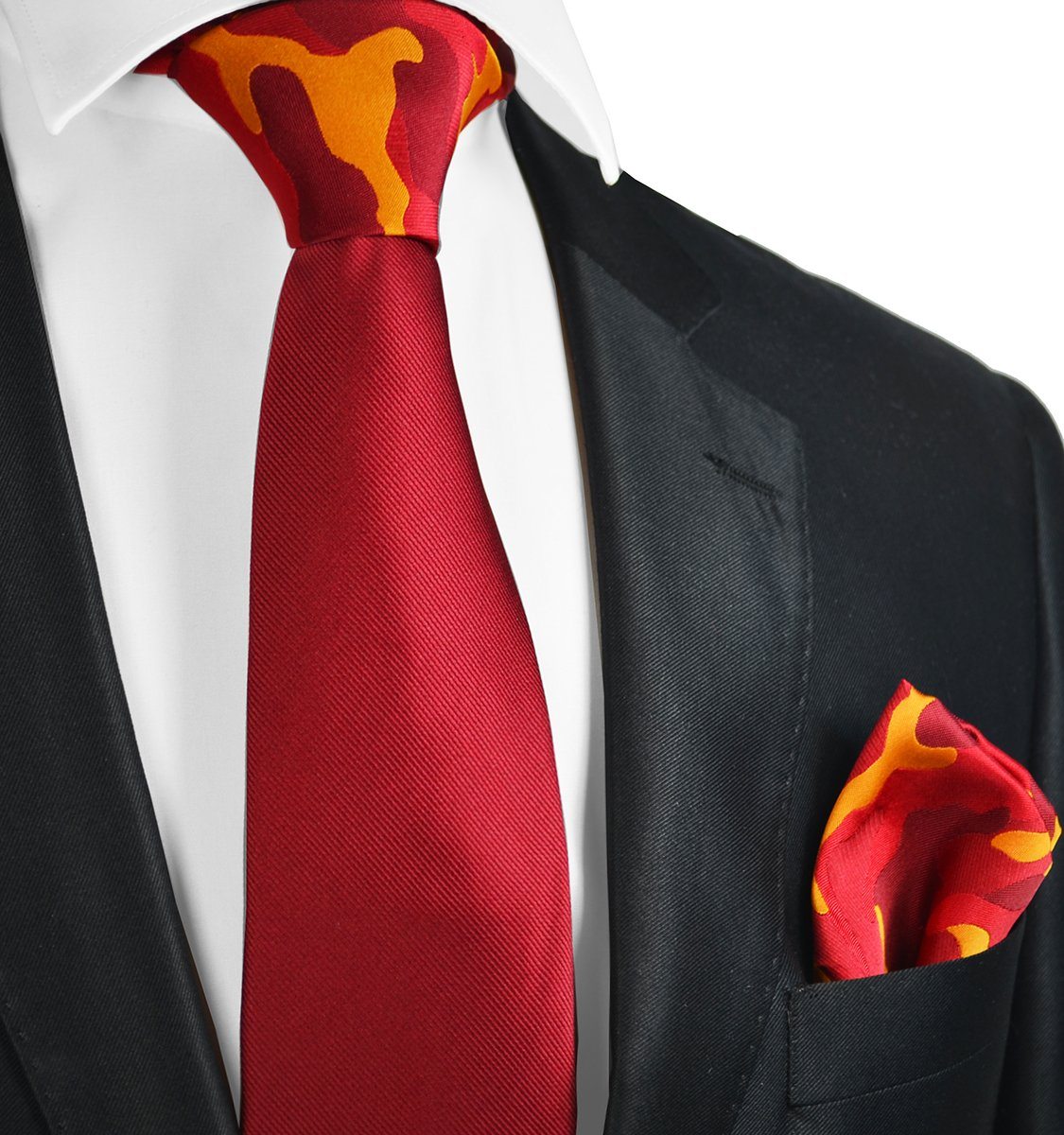 Solid Red and Camo Paul Malone contrast knot tie with matching pocket square. Hand made and jacquard woven. 100% microfiber. Imported. Get ready to stand out with this Solid Red and Camo Paul Malone contrast knot tie set! Not only will you have a stylish and unique look with its quirky camo pattern, but it's also hand made and jacquard woven for the highest quality. Made from 100% microfiber, this tie set is both comfortable and durable. So don't settle for boring ties and be prepared to turn heads with this imported, one-of-a-kind knot set.